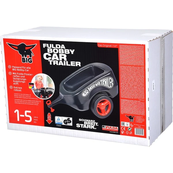 Der Fulda-Bobby-Car-Trailer ist optimal für den schwarzen Renner geeignet. Der Anhänger besitzt die bewährten Breitreifens des Fulda-Bobby-Car. Im Inneren des robusten Anhängers ist viel Platz für alle wichtigen Utensilien der kleinen Fahrer. Abgerundete Ecken und Kanten sorgen für ein sicheres Spielvergnügen. Der robuste Anhänger lässt sich leicht mit dem enthaltenen Sicherheitskupplungsstift an allen BIG-Bobby-Car befestigen.Art.-Nr.: 1195298