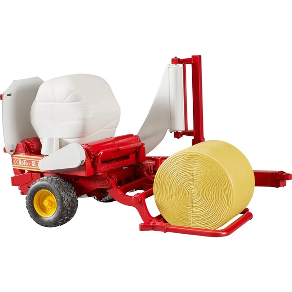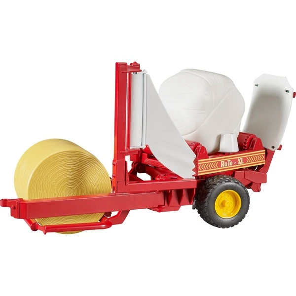 Der Ballen wird über die Beladewippe vorne auf den Drehteller gehoben. Nach dem Absenken der Beladewippe wird der, während des Fahrbetriebs selbsttätig drehende Drehteller, aktiviert und so der Wickelvorgang simuliert. Beim Wickelvorgang wird der aufgeladene Rundballen mit Hilfe des rotierenden Aufbaus um seine Hochachse und zugleich mittels der angetriebenen Drehwalzen um die Axialachse gedreht. Danach wird der Ballen über die Abkippvorrichtung auf die bewegliche Ablagewippe gekippt. Ein ockerbrauner und ein weißer Rundballen sind im Lieferumfang enthalten. Die Zugdeichselposition kann nach Gebrauch eingestellt werden und Profilreifen runden das Bild ab.Art.-Nr.: 1233212