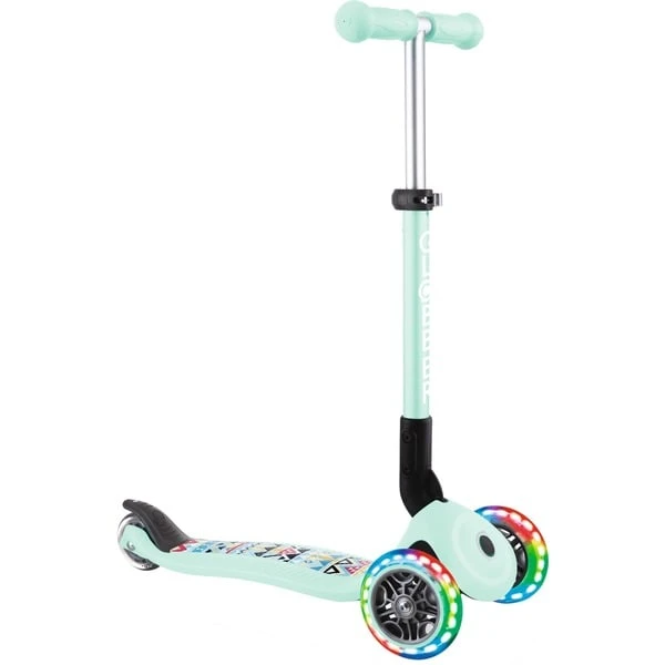 Mit dem Junior Foldabe Fantasy Lights von Globber kommen Kinder ab zwei Jahren auf Touren: Dieser Scooter steht auf drei Polyurethan-Rollen und hat ABEC 5-Kugellager. Die vorderen Rollen leuchten batteriefrei, der Lenker lässt sich in drei Höhen verstellen. Dabei kann über die Kippbewegung des Lenkers, der mit ergonomischen TPR-Griffen ausgestattet ist, gesteuert werden. Auf dem rutschfesten Deck finden auch kleine Füße sicheren Stand – die Reibungsbremse am Hinterrad verzögert zuverlässig. Zum einfachen Transport ist dieser Scooter faltbar oder kann im Trolley-Modus gezogen werden.Art.-Nr.: 1818463