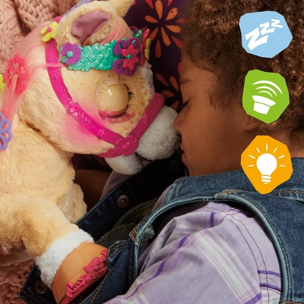Tierchenliebhaber und Ponyfans dürfen sich freuen, denn hier kommt Cinnamon, mein stylisches Pony! Mit über 80 Geräuschen und Reaktionen reagiert diese 35 cm große Schönheit besonders ausdrucksstark! Cinnamon, mein stylisches Pony blinzelt und bewegt seine Ohren, seinen Kopf und Hals. Die hübsche Ponydame reagiert, wenn sie gefüttert wird und wenn ihr Rücken, ihre Wangen oder Nase gestreichelt werden. Das Pony gibt Küsschen- und andere liebevolle Geräusche von sich und seine Wangen leuchten sogar! Kinder können dieses bezaubernde bewegliche Tierchen mit viel Freude und Spaß bürsten und stylen, denn es kommt mit 26 Styling- Accessoires, darunter 4 schimmernde Hufeisen, eine Blumenkrone und 20 Blumen-Haardekorationen für sein Zaumzeug. Ihr Apfel-Accessoire dient sowohl als Bürste als auch als Snack! Während das Pony in einer sitzenden Position im Schlafmodus ein Lied spielt, können Kinder ab 4 Jahren mit ihm kuscheln und den Tag ausklingen lassen. Art.-Nr.: 1852765