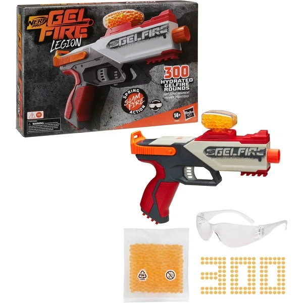 Stürze dich in die Schlacht mit den Nerf Pro Gelfire Blastern, deren hydrierte Kugeln beim Aufprall explodieren! Die Nerf Pro Gelfire Kugeln sind in der Packung noch dehydriert, so dass eine große Menge an Kugeln auf kleinem Raum untergebracht werden kann. Wird Wasser hinzugefügt, um die Patronen zu hydratisieren, so sind sie zum Gebrauch bereit. Die hydrierten Kugeln feuern mit hoher Geschwindigkeit aus dem Blaster und explodieren, wenn sie ein Ziel treffen. Damit ist kein Aufheben der Patronen mehr nötig. Der Nerf Pro Gelfire Legion Blaster verfügt über eine Federzündung, für die keine Batterien benötigt werden. Mit der Slam-Fire-Funktion kann er einen anhaltenden Strom von Kugeln abfeuern. Er enthält einen Trichter mit 130 Schuss Kapazität und eine Abzugssperre gegen versehentliches Abfeuern. Er wird mit einem Beutel mit 5000 Kugeln ausgeliefert. Art.-Nr.: 100010286
