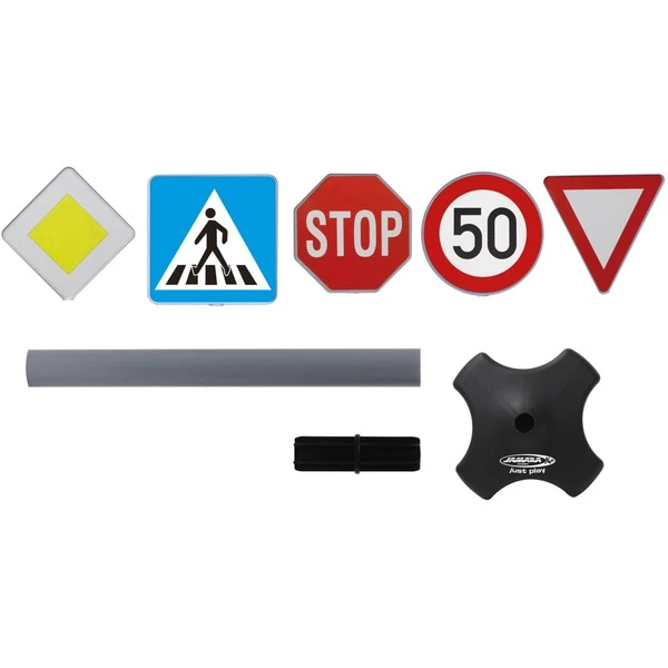 | Inhalt/Ausstattung | Set mit 5 verschiedenen Verkehrsschildern: Stop, Fußgängerüberweg, Höchstgeschwindigkeit 50, Achtung, Vorfahrtstraße | ||