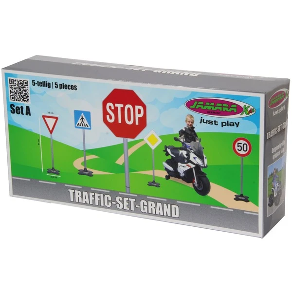 Sicherheit im Straßenverkehr spielerisch trainieren mit dem Verkehrsschilder-Sets von Jamara. Mit fünf verschiedenen Straßenschildern im Set können die Kleinen spielerisch die wichtigsten Verkehrsregeln und Verhaltensweisen im Straßenverkehr erlernen. Die Verkehrszeichen eignen sich auch hervorragend für den Einsatz als Lern-Parcours im Unterricht. Die Schilder bestehen aus stabilem aber leichtem Kunststoff, sodass sich die Kinder bei einem Zusammenstoß nicht verletzen können. Jedes Verkehrsschild besteht aus 4 Elementen, die sich kinderleicht zusammenstecken lassen.