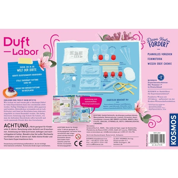Ein zauberhafter Einstieg in die Welt der Gerüche. Mit diesem Labor werden zarte Düfte in verschiedensten Formen verarbeitet: Duftende Farbe und mit Blüten und Gewürzen verzierte Duftsteine. Bald riechen nicht nur Kinderzimmer und Bad wohltuend, sondern auch selbst gemachte Lesezeichen und farbige Blumen aus Filterpapier. Besonderes Extra: bunt geschichteter, duftender Sand in einer wunderschöner Herzflasche. Dazu verrät die Anleitung des KOSMOS Experimentiersets, wie der Geruchssinn des Menschen funktioniert, wie Pflanzen Duft-Aromen produzieren und weitere spannende Fakten rund um das Thema Parfum und Geruch. Eine spannende Reise in die Welt der Aromen für Kinder von 8 bis 12 Jahren.Art.-Nr.: 1732686