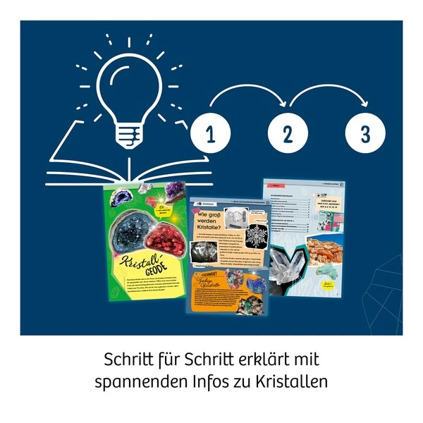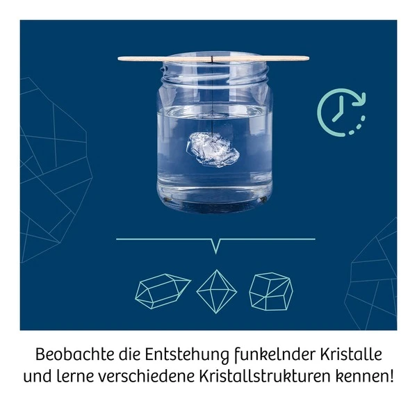 Dieses große Kristallzucht-Set steckt voller Kreativität und Möglichkeiten. Kinder ab 10 Jahren erschaffen damit ihre eigene funkelnde Welt: Schillernde Einzelkristalle entstehen über Nacht, eine glitzernde Kristallhöhle wird selbst hergestellt, Gipsfiguren werden mit einer zauberhaften, kristallinen Hülle überzogen und funkeln in der kleinen Schatztruhe. Mit anschaulichen Bildern erklärt das Anleitungsheft des Experimentierkastens, wie die Wunderwerke in verschiedenen Versuchen hergestellt werden und zeigt, wie man die Größe, Farben und Formen der wachsenden Kristalle beeinflussen kann. Und welches Fachwissen aus den Bereichen Geologie, Chemie und Mineralogie steckt eigentlich dahinter?Art.-Nr.: 1904776