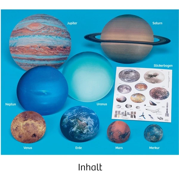 | Inhalt/Ausstattung | Planeten-Set mit 8 gewölbten Planeten für die Zimmerwand samt Aufhängung, Zusatzmaterial: Stickerbogen mit Weltraum-Motiven, Anleitung | ||