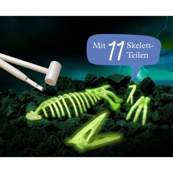 | Inhalt/Ausstattung | Nachtleuchtendes Kunststoffskelett aus 11 Teilen im Gipsblock, Standfuß, Hammer, Meißel, Schwamm | ||