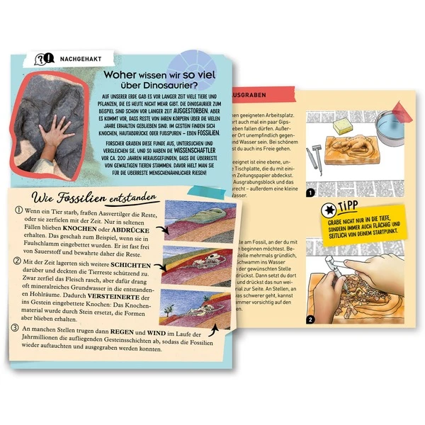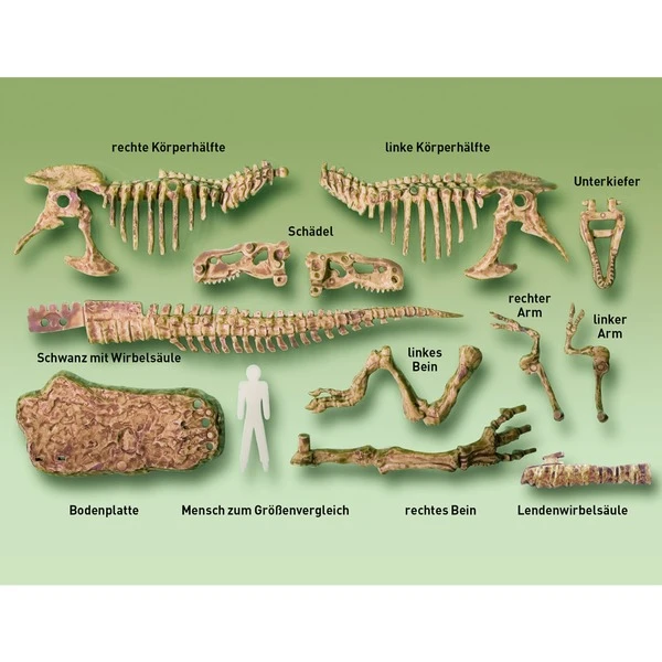 Auf ins Ausgrabungs-Abenteuer! Im Gestein verstreut liegen die Knochen eines Tyrannosauraus, die vorsichtig mit Hammer und Meißel freigelegt werden müssen. Echte Urzeit-Atmosphäre schafft die Gestaltung des Gips-Blocks, der die Form eines versteinerten 3D-T-Rex zeigt, als wäre er gerade erst gestorben! Sind die Knochen dieses Urzeit-Giganten erst einmal ausgegraben, bauen die Kinder zwischen 7 und 9 Jahren das Skelett zusammen und stellen es als tolle Deko in ihrem Zimmer auf. Wer genau hinsieht kann neben dem Skelett sogar das Modell eines Menschen erkennen, zum Größenvergleich! Mit dem KOSMOS Ausgrabungs-Set erleben Kinder Dinosaurier im eigenen Kinderzimmer!