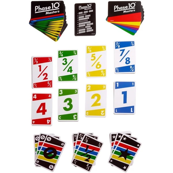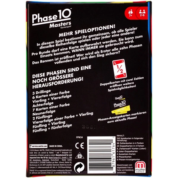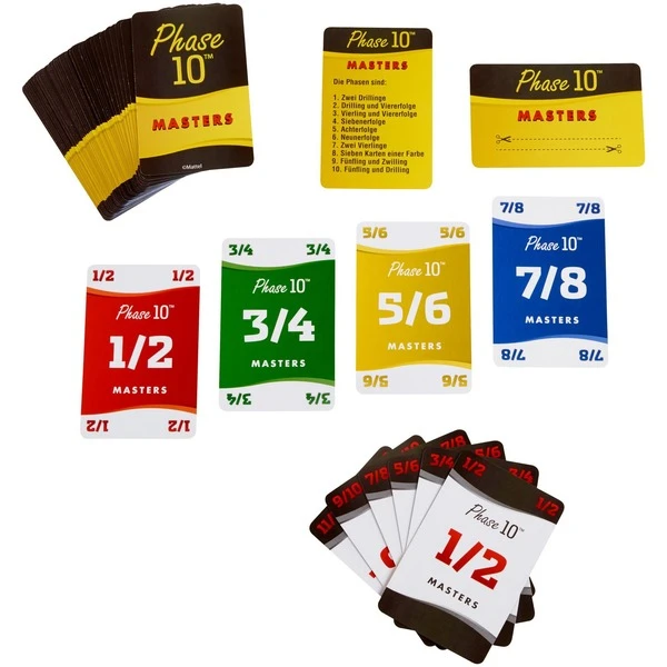 | Inhalt/Ausstattung | Enthält insgesamt 150 Karten: 2 Kartensätze von 1-12 in 4 Farben, 8 Joker-Karten, 4 Aussetzen-Karten, 6 Doppel-Karten in 4 Farben, 6 Joker-Doppel-Karten, 6 Phase-Karten und 6 Phasen-Anzeigekarten | ||