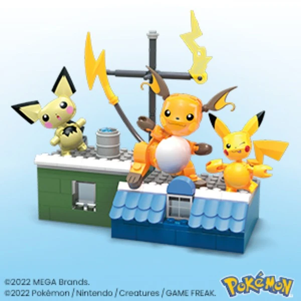 | Inhalt/Ausstattung | Pokémon-Figuren Pichu, Pikachu und Raichu, zusammenbaubar und beweglich. 160 Steine und Teile, mit denen 3 Figuren unterschiedlicher Größe und eine thematisch passende Umgebung gebaut werden können. | ||