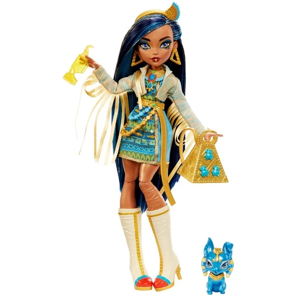 Die Schule hat wieder begonnen und die Ghule der Monster High tauchen in ihrem kreischtastischen Stil auf! Die Cleo de Nile Puppe stolziert in einem Outfit, das von ihrer königlichen Narbe inspiriert ist, mit einem königsblauen Kleid mit von Mumienbinden inspirierten Ärmeln und einem wunderschönen Kettengürtel durch die Flure der Monster High. Ihr gruselig-schicker Look wird komplettiert durch kniehohe Stiefel, einen pyramidenförmigen, mit Skarabäus besetzten Rucksack und glamouröses, goldenes Zubehör. Bring den Cleo de Nile Puppen-Look auf das nächste Level mit einer fabelhaft freakigen Fransenjacke und Zubehör. Und ihr gruselig-süßer Welpe, Tut, inspiriert zu gespenstischem Geschichtenerzählen!Art.-Nr.: 1918891