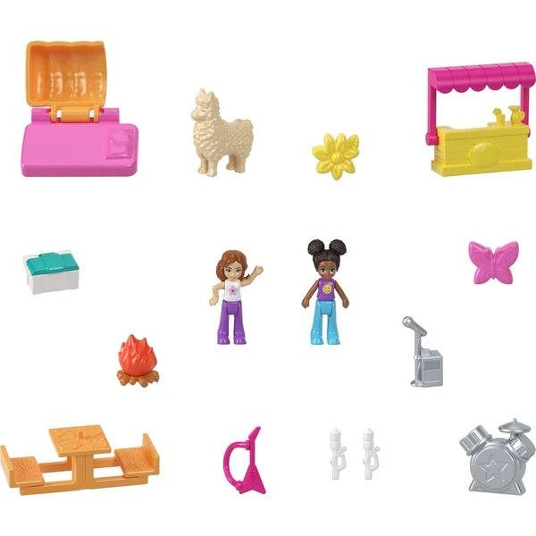 Dieses Set aus der Serie Polly Pocket ist ein tolles Spielzeug für unterwegs mit vielen niedlichen Details. Auf der Außenseite der Schatulle befindet sich das Gesicht eines Lamas. Die aufklappbare Schatulle hat ein Handgelenkband und eine tolle Blumenkrone. Im Inneren befinden sich zwei kleine Puppen, fünf bewegliche Spielelemente und 13 Accessoires – darunter ein Lama, eine aufklappbare Kühlbox und ein Schlafsack in den eine Puppe passt. Die Feriencamp-Ausstattung dieses Sets wird durch ein Zelt, eine Bühne mit herunterklappbarer Tür, einen Limonadenstand und eine sich drehende Bühne komplettiert. Art.-Nr.: 1889199