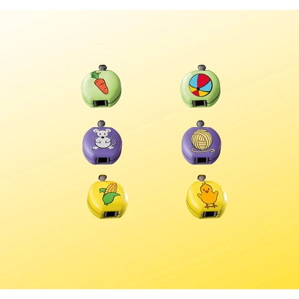| Inhalt/Ausstattung | 1 Schaffner, 1 Mädchen, 1 Junge, 1 Schiebeelefant, 1 Schiebekatze, 1 Schiebhuhn, 3 Stecksteine mit beidseitiger Bedruckung | ||