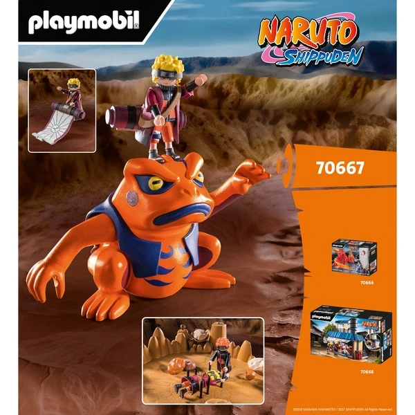 | Inhalt/Ausstattung | Figuren: 1 Naruto, 1 Pain. Tier: 1 Gamakichi (Frosch). Zubehör: 1 Krater- Bodenplatte, 1 Kreisel, 6 Stäbe, 2 Steine, 4 Felsen. | ||