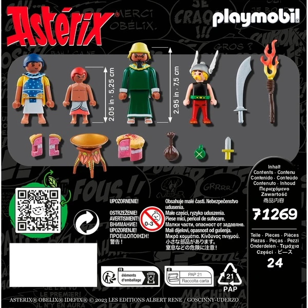 | Inhalt/Ausstattung | Figuren: Asterix, Pyradonis, Schraubzieris, Kleopatras Vorkoster. Zubehör: 1 Tisch, 1 Torte, 2 Kuchenstücke, 1 Messer, 1 Schwert, 1 Fackel, 1 Beutel,1 Trinkflasche, 1 Helm, 1 Hut. | ||