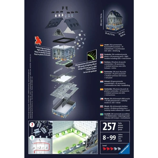 Schaurig schöner Puzzlespaß für alle ab 8 Jahren, die Halloween mögen und unheimlich gerne Puzzeln. Dabei sind viele gruselige Details auf dem 3D Puzzle Gruselhaus zu entdecken. Das LED-Leuchtmodul lässt die Szenerie von innen erstrahlen. Schaurig schön und schrecklich gespenstisch, wenn das nicht die perfekte Halloween Deko ist! Die bebilderte Anleitung ermöglicht Einsteigern wie Fortgeschrittenen Erfolg beim Zusammensetzen der 216 formstabilen Kunststoff-Puzzleteilen sowie der Zubehörteile.Art.-Nr.: 1746266