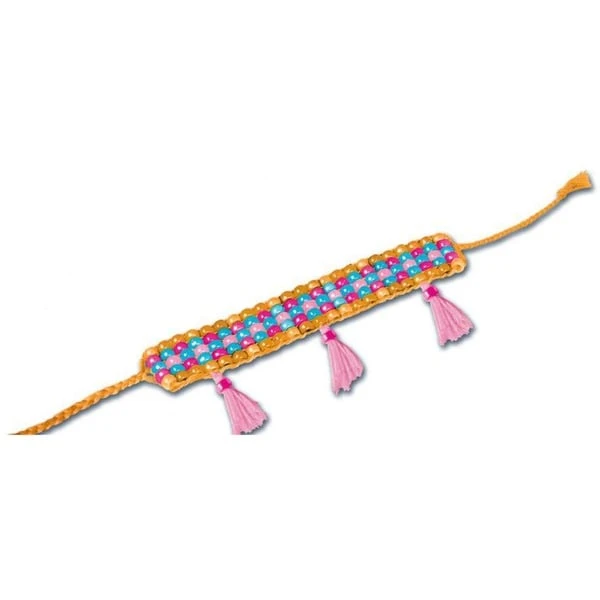 | Inhalt/Ausstattung | 1 Webrahmen, 1250 Perlen, 6 Labels, Stickgarn in drei verschiedenen Farben, 1 Quastentool, 1 stumpfe Nadel, 6 Fixierstreifen, 1 ausführliche Anleitung | ||