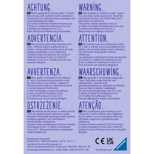 | Nicht geeignet für Kinder unter 7 Jahren. Benutzung unter Aufsicht von Erwachsenen. Anweisung vor Gebrauch lesen, befolgen und nachschlagebereit halten. Die Farben enthalten Reaktionsmasse aus 5-Chlor-2- methyl-2H-isothiazol-3-on und 2-Methyl-2H-isothiazol-3-on (3:1) Kann allergische Reaktionen hervorrufen. | |||