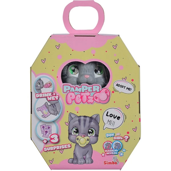 Pamper Petz – die süßen Pamper Petz Tierbabys suchen einen Besitzer, der sie adoptiert, ihnen einen Namen gibt und sich liebevoll um sie kümmert. Die süße Windelbande besteht aus einem Hündchen, einem Kätzchen und einem Häschen, die alle eine Windel tragen. Mit Trink- und Nässfunktion – das süße Katzenbaby mit den großen glitzernden Augen kann richtig trinken. Ab und zu macht es auch einmal in die Windel. Dazu klappt man einfach die Hinterbeine nach vorne und setzt das Kätzchen hin. Ist die Windel nass, verfärbt sich das Innere Gelb. Magische Pfote – ob es sich bei dem eigenen Haustier um einen Jungen oder ein Mädchen handelt, verrät die magische Pfote. Wischt man mit Wasser darüber, so verfärbt sich diese entweder Blau oder Pink und gibt somit Aufschluss über das Geschlecht. Mit drei Überraschungen – im Set sind neben dem 15cm großen Katzenbaby drei Überraschungen zum Pflegen und Füttern des Kätzchens sowie eine Adoptionsurkunde zum Beschriften enthalten.Art.-Nr.: 1623596