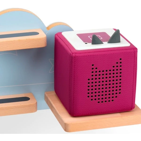 Das Tonie Regal „Auf der Traumwolke“ in der Farbe Himmelblau ist die perfekte Bühne für die Tonie-Sammlung. Dabei ist es viel mehr als ein dekoratives Wandregal: Es ist eine moderne Bibliothek, die entworfen wurde, um die Lieblings-Tonies, die Toniebox und ihre Ladestation unterzubringen. Auf der himmelblauen Wolke ruhen die liebsten Einschlafhilfen wohl behütet, bevor sie ihren Besitzer ins Träumeland begleiten. Süße Motive aus der Tonie-Welt machen den bezaubernden Blickfang zum einzigartigen Hingucker in jedem Kinderzimmer. Bis zu 20 Tonies stehen oder hängen sicher auf den magnetischen Holzflächen. Die Toniebox hat ihren eigenen Platz mit Öffnung und Vertiefung für ihre Ladestation. Das Regal lässt sich schnell und einfach an der Wand montieren, die passenden Schrauben und Dübel sind dabei.Art.-Nr.: 1918276