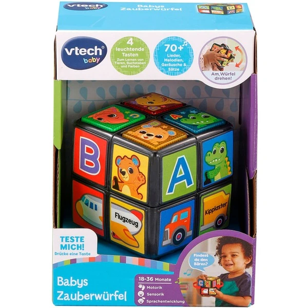 Drehen und lernen mit Babys Zauberwürfel! Dieser leuchtende Würfel bringt den Kleinsten ab 18 Monaten einfache Sätze bei. Wird der Würfel, sind viele verschiedene Kombinationen an Tierfreunden und Fahrzeugen möglich. Damit fördert er die motorischen Fähigkeiten, die Hand-Auge-Koordination und das logische Verständnis.Art.-Nr.: 1895996