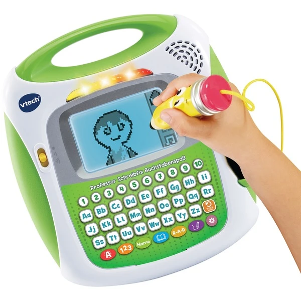 Diese interaktive Schreibtafel mit der Figur Professor Schreibfix als integriertem Stift bietet 5 Aktivitäten: Finde den Schatz als Leseübung, Buchstabieren und Lesen, einen Namen schreiben, Buchstaben nachfahren mit passenden Grafiken und Schritt-für-Schritt-Zeichenaktivitäten. Professor Schreibfix gibt direkt eine Rückmeldung, wenn das Kind mit dem Stift schreibt oder zeichnet. Das Gerät verfügt über einen beleuchteten und extra breiten Bildschirm für längere Wörter. Durch die Verknüpfung von Sehen, Hören und Schreiben wird das Lernen erleichtert.Art.-Nr.: 100004734