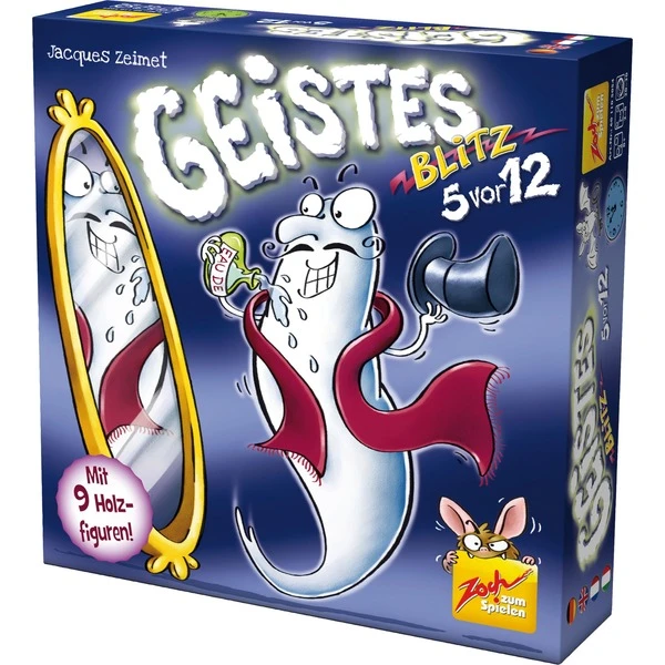 Ein Reaktionsspiel der Extraklasse, das Spielwitz, Verwirrung, kombinatorische Spannung und Nervenkitzel einzigartig vereint. Neun hochwertige Hozgegenstände stehen in der Tischmitte. In bewährter Geistesblitz-Manier sind alle Spieler gleichzeitig aufgerufen, den gerade gesuchten Gegenstand zu erkennen. Doch die vier zusätzlichen Objekte bringen eine völlig neue Dynamik ins Spiel: Wenn die Geisterstunde anbricht, weil der Geist auf eine Uhr trifft, muss die dort sichtbare Uhrzeit verkündet werden. Und auch der Zauberspiegel hat es in sich, denn was sich hier spiegelt, ist hoch begehrt! GEISTESBLITZ 5 vor 12 ist ein MUSS für Geistesblitzfans und alle, die es noch werden könnten.Art.-Nr.: 1195357
